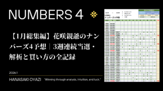 花咲親爺のナンバーズ4予想 【1月総集編】花咲親爺のナンバーズ4予想|3週連続当選・解析と買い方の全記録 2026年1月のナンバーズ4予想を総まとめ。花咲親爺が3週連続当選を達成した実績、連続数字の読み方、セット・ストレートの使い分け、解析表の考え方を徹底解説。 花咲親爺のナンバーズ4予想