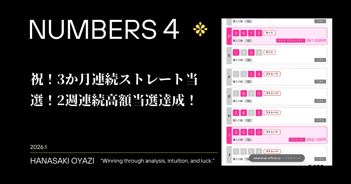 ナンバーズ4予想を11月にスタートしてから約3か月。累計当選金額は2,020,200円となり、「解析・ひらめき・運」を組み合わせた数字選びが、決して偶然だけではないことを証明できたと感じています。