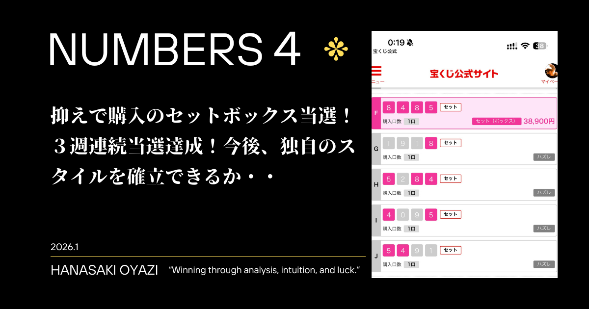 この結果を受け、花咲親爺のナンバーズ4予想は、3週連続当選という快挙を達成しました。