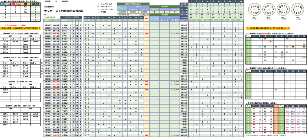 結果としてはニアピンとなりましたが、内容的にはかなり惜しい結果でした。予想の中には「0361」「0364」「4160」といった数字が含まれており、主軸であった「03」「06」「14」もきっちり出現しています。